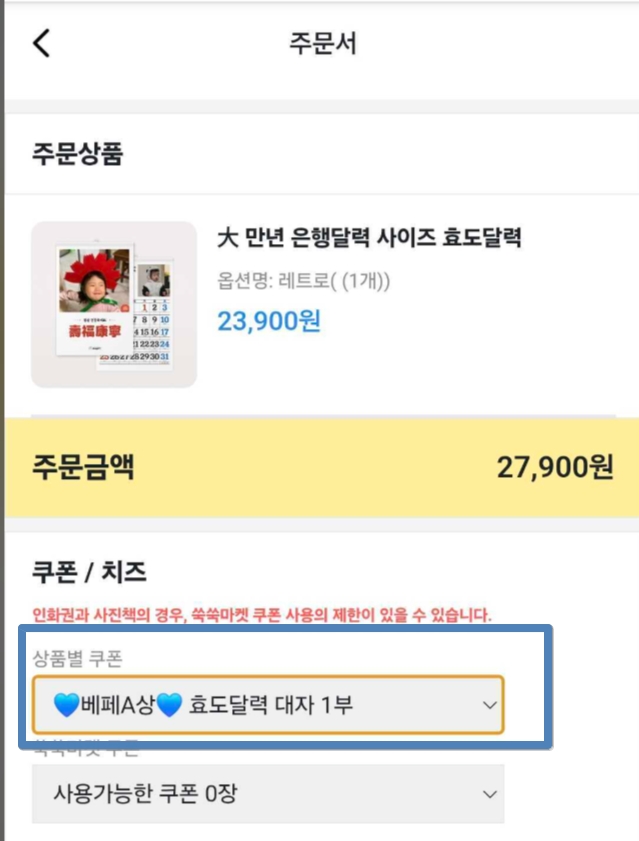 2)결제단에서 "상품별쿠폰"에서 수령 받으신 A상-효도달력 쿠폰을 적용해 주세요