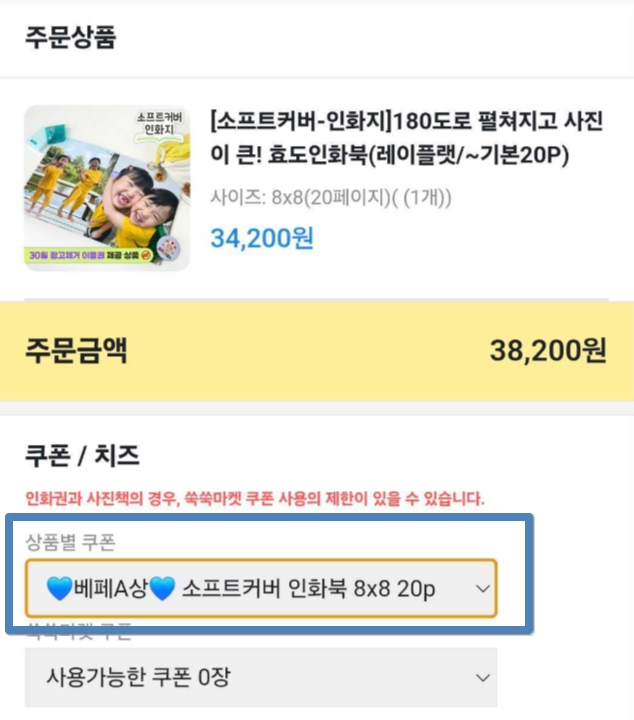 2)결제단에서 "상품별쿠폰"에서 수령 받으신 A상-인화북 쿠폰을 적용해 주세요